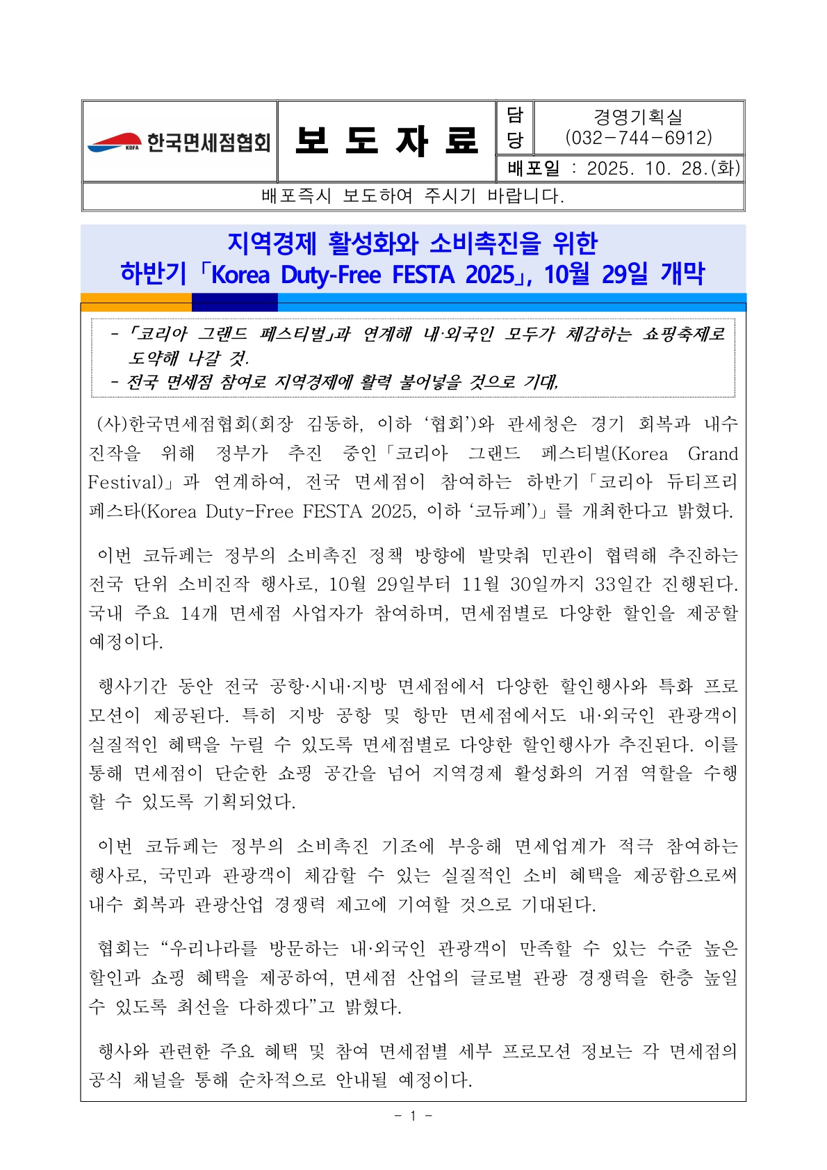 | [보도자료] 하반기 「Korea Duty-Free FESTA 2025 (코리아 듀티프리 페스타 2025)」 , 10월 29일 개막 |